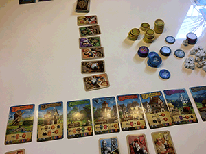 | Relativ viele Karten und relativ viel Münzen. Vorne das Königreich eines Spielers mit den Gebäuden und darunter angelegten Personen. Weitere Personen warten in der Auslage (Mitte oben). Auf den ersten beiden liegen Meeples – hier es ein Spieler zuvor auf die dritte Person abgesehen und musste dafür auf den ersten beiden je einen Meeple einsetzen. Bild: spielwieses.at |