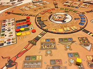 Nun nochmals zum eigentlichen Schauplatz zurück, dem Kreis der Göttertafeln. Sie stellen fünf Bereiche der altägyptischen Lebens- und Götterwelt dar: Göttergaben, Beamte, Geschenke des Nils, Handwerker und das Tal der Toten. Jeder dieser fünf Bereiche bietet spezielle Möglichkeiten fürs Punktesammeln. Mal braucht es unterschiedliche, mal braucht es gleiche Ressourcen um den Vorteil einer Göttertafel zu lurkieren. Mal erhält man dafür Karten, wie bei Handwerkern und Beamten, die zu weiteren Fähigkeiten oder am Ende zu Götterpunkten führen. Oder man baut im Tal der Toten die nächste Stufe seines Grabmals aus.