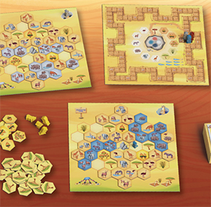 | Die Tabeleaus der Spielenden (links oben und unten) sind mit den gleichen Tierplättchen untesrchiedlich befüllt. Die Tierplättchen sollen punktebringend versetzt und zu Herden zusammengeführt werden. Wie viele Punkte es gibt, entscheidet sich am Ende, wenn elf Wertungen nach unterschiedlichen Gesichtspunkten (Tafel oben rechts) abgehandelt werden. Bild: Deep Print |