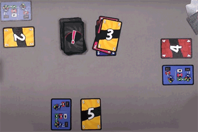 | Der Spieler rechts mit der roten 4 in seiner Auslage hat eine gelbe 3 auf den Ablagestapel (oben Mitte) gespielt. Damit will er den Spieler unten provozieren. Hat dieser nämlich keine 3 oder eine gelbe Karte auf der Hand, muss er seine ausliegende gelbe 5 abwerfen. Die fünf Punkte wären dahin. Hätte der Spieler unten aber eine Karte, die nicht passt und legt diese vor sich ab, dann liegt es beim Spieler links sich aus der Lage zu bringen, seine gelbe 2 nicht opfern zu müssen. |
