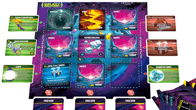 Aufdecken. Oder treffender gesagt, ein Abtragen. Der Asteroid = der Spielplan ist in drei mal drei Felder unterteilt. Auf jedem Feld liegen verdeckt neun quadratische Wertkärtchen. Ganz unten dreimal ein Kern, darauf dreimal ein Mantel und obenauf drei Kärtchen Kruste. Von oben dringen wir durch das Abtragen der Schichten in das hinein, was sich auf dem Himmelskörper im Laufe der Jahrhunderte so angesammelt hat.