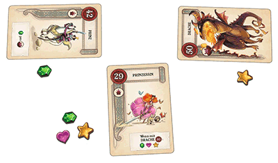 | Ein Beispiel, wie ein Stich abgerechnet wird. Die Karte mit dem Wert 50 ist die höchste und gewinnt den Stich. Ihr Besitzer erhält für den Stich 1 Stern. Wer die 29 ausgespielt hat, erhält jedoch 1 Stern, 1 Herz und 1 Kristall, weil auch der Drache (50) in der gleichen Runde ausgespielt wurde. Und die 42 erhält 1 Kristall, da das Attribut Monster im Stich war (beim Drachen). Bild: Amigo |
