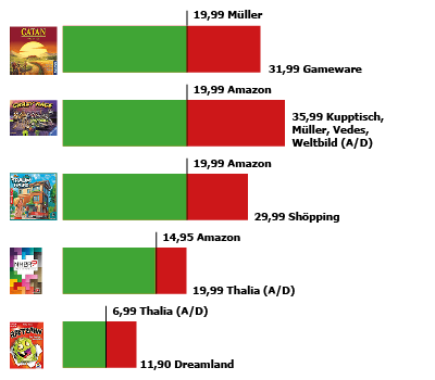 Auffällig auch in diesem Jahr: Bei Catan (UVP 29,99) lassen sich einige Händler erst gar nicht auf den Preiskampf ein und führen dieses Spiel online nicht.