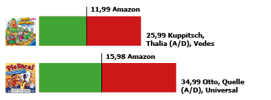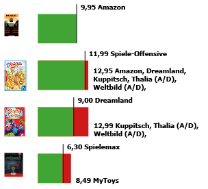 Kinderspiele sind in den Monaten und Wochen besonders preisumkämpft. Und je bekannter das Spiel – oder je intensiver im Fernsehen beworben – umso mehr gehen die Preis rauf und runter. Die zwei Kinderspiele, die wir 2017 in die Auswahl nahmen, machen das besonders deutlich. Der Durchschnittspreis für den Klassiker Lotti Karotti und das Hasbro-Spiel Pie Face veränderte sich seit September zwar nur unwesentlich, aber man darf darauf vertrauen, dass besonders begehrte Kinderspiele zwischendurch bei der einen oder anderen großen Kette zumindest zwischenzeitlich in die Kategorie Kampfpreis oder als Lockvogel eingestuft werden. So erklärt sich auch, dass zu Beginn dieser Woche (stellvertretend) diese beiden Spiele bei mehreren Anbietern mehr als doppelt so teuer waren als beim Billigstbieter (in diesen Fällen Amazon).