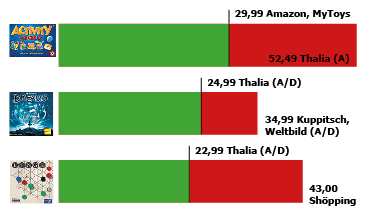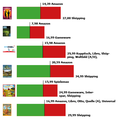 In diese Auswahl haben wir neben dem Klassiker Catan vier Neuheiten dieses Jahres aufgenommen. Typisch für diese Spielekategorie, die sich meist im Preisspektrum zwischen 25 und 40 Euro bewegt: Wer bei Online-Einkäufen die bewusste Auswahl trifft, spart in Regel ein Drittel des empfohlenen Verkaufspreis bzw. gegenüber dem teuersten Angebot.