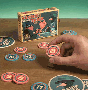 Black Jack als Stichspiel mit Farb- und Zahlenscheiben, so könnte man 12 Chip Trick umreißen, das zuerst in Japan im Eigenverlag des Autors erschienen ist. Die Mitspieler sehen immer, welche Farbe deine Chips auf der Hand haben – die roten haben die Zahlen 4 bis 9, die blauen die Zahlen 1 bis 3 oder 10 bis 12. Gehst du mit? Am Ende darf die Summe der gewonnenen Chips nicht höher als 21 sein.