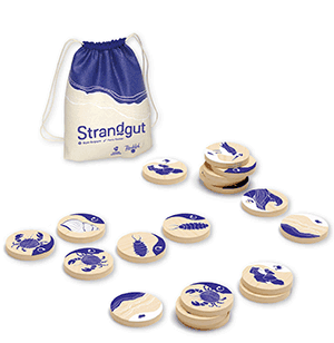 - Strandgut ist ein Spiel, das aus Kanada übernommen wird und im Sommer erscheinen soll. Auch wenn das Spiel ein mairitmes Thema hat, ist es doch recht abstrakt. Aus einem Beutel ziehst du einen Holzstein und schaust ihn dir geheim an und entscheidest, ob du ihn ins Meer spielst – das ist die gemeinsame Aus- und Ablage in der Mitte – oder in deinen persönlichen Strandbereich. Je nachdem und je nachdem welches Motiv – vom Strandläufern über Krebse bis zum Vogel – es ist, kannst du weitere Aktionen ausführen. Ziel ist es, in seinem Strandbereich den höchsten Stapel an Strandgut zu sammeln.