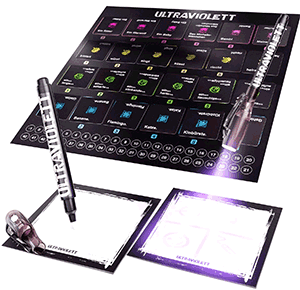 «Angela Merkel schminkt ein gestreiftes Katzenklo», «Ein Drache küsst einen giftigen Pickel» oder «Ein Pirat faltet ein eckiges U-Boot». Solche absurden Begriffe sollen bei Ultraviolett gezeichnet werden. Sie ergeben sich aus einem Raster von Karten. Was aber gezeichnet werden soll, weiß nur einer. Die anderen müssen es am Ende erraten. Nur: Der Zeichner geht mit unsichtbarer Tinte ans Werk, das erst im ultravioletten Licht sichtbar wird.