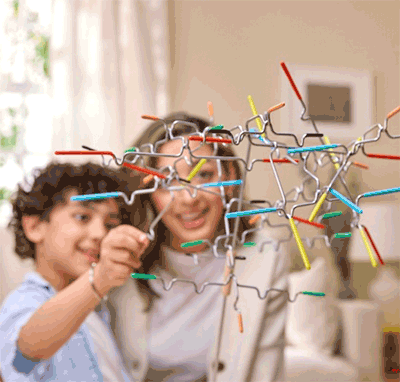 Auch die zweite Neuheit hat eine Hintergrundgeschichte. Das Spiel heißt Suspend, was übersetzt treffend auf "schwebend" hindeutet, und könnte auch als wachendes Mobile bezeichnet werden. Aber, es gibt eben ein Regelwerk! Ein Farbwürfel gibt vor, welcher Stab als nächstes in das wacklige Gebilde eingebaut werden muss, ohne dass alles zusammenfällt. Dazu gibt es drei Spielvarianten. Das Original kam 2012 in Amerika auf den Markt und gibt es dort noch immer, auch in einer Juniorversion. Der Verlag heißt Melissa & Doug, wurde 1988 gegründet und ist mittlerweile eine Tochterfirma von Spin Master.