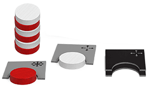 Die Plättchen, zu denen die beiden Spieler von Alto ihre Scheiben legen, bestimmen die Zugrichtung fürs Versetzen. Bild: Helvetiq |