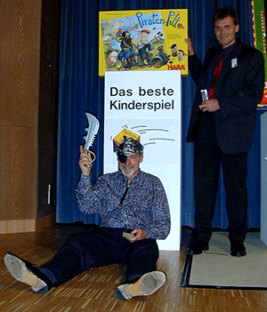 Mit diesen Worten bedankt sich der mehrfache Preisträger von Spiel des Jahres. Er hat, wie berichtet, Ende Juni seinen 75. Geburtstag gefeiert. Zuvor war er in den Urlaub abgetaucht, um dann gestärkt den Glückwunschreigen zu überstehen. In seiner E-Mail schrieb er dann: "Vieles ist geschehen in den letzten 75 Jahren. Manches ist gelungen, manches ist missraten, manches ist vergessen. So konnte ich mich auch nicht mehr an das Bild in der Anlage (rechts, Anm.) erinnern, obwohl es ein sehr glücklicher Anlass war. Es war vor 17 Jahren als ich auf der Messe in Essen den Deutschen Spielepreis für das Kinderspiel „Piraten Pitt“ erhielt."