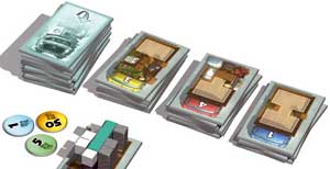 Beim Spiel geht es primär um das möglichst optimale Beladen von Lkws. Das sind die Karten, die eine unterschiedliche Ausdehnung der Ladefläche in zwei Dimensionen haben: einmal im Grundriss, einmal in der Höhe, die durch die Zahlen 1 bis 4 die Ebenen angibt, die man zum Stapeln zur Verfügung hat. |
