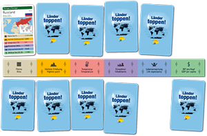 Länder toppen! hat für dieses Grundprozedere noch einen Turbo eingebaut. Es gibt sechs Kategorien und so wäre unter- und oberhalb des Kartonstreifens Platz für insgesamt zwölf Karten, Doch so viele bekommen die Spieler nie auf die Hand (wie viele genau, hängt von der Spieleranzahl ab). So bleiben einige "Felder" zwangsläufig leer. Dadurch müssen sie sich in jeder Runde gut überlegen, welche Länderkarte bei welcher Kategorie die besten Chancen hat zu stechen. Nach mehreren Spielen entwickelt man dafür ein Gefühl und Länder toppen! wird dadurch schneller, gleichzeitig nimmt allerdings der Reiz ab, von den zufälligen Vergleichskonstellationen überrascht zu werden. Was wiederum die Kommunikation anregt. Bei 120 verschiedenen Länderkarten hat das Spiel jedoch ein respektables Potenzial.