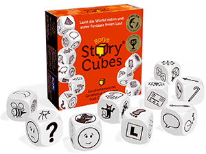 Story Cubes, das sind neun Würfel. Auf jeder Seite befindet sich ein anderes Bild oder Symbol. Man wirft und soll nun eine Geschichte fabulieren, in der alle neun Bilder miteinander verknüpft sind. Wie, ist der Fantasie und der Intuition des Einzelnen überlassen. Wichtig ist nur: Alle neun Bilder müssen in der Erzählung vorkommen.