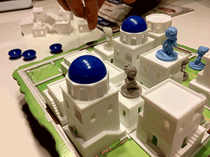 Nicht nur optisch sind dabei die blauen Kuppeln die Sahnehäubchen. Die Kuppeln dienen als letzter Ausweg, den Sieg eines Mitspielers zu verhindern oder zumindest hinauszuzögern (siehe oben: besetztes Feld). Denn sehr häufig ergeben sich vorübergehende Pattsituationen bei Santorini. Wer Gegnern ein weiteres Stockwerk vor die Nase stellt, erschwert zwar deren Aufstieg auf ein höheres Stockwerk, verbaut sich damit aber leicht auch selbst den eigenen Weg aufs Siegertreppchen. Und schneller als einem lieb ist, landet ein Arbeiter eingekesselt im Out, weil er von Feldern = Gebäuden umgeben ist, die allesamt mehr als ein Level höher sind.
