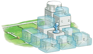 | Eigentlich einfach, aber das räumliche Vorstellungsvermögen ist bei Menschen unterschiedlich ausgeprägt. Zur Verdeutlichung schematisch dargestellt: Oben Aktion 1, das Ziehen eines Arbeiters auf ein Nachbarfeld. Hier gibt es sieben von acht Möglichkeiten. Auf das Gebäude rechts hinten geht nicht, weil mehr als ein Stockwerk (Levels) höher als der Ausgangspunkt. Unten: Aktion 2, das Bauen. Möglich auf allen acht Nachbarfeldern. Man beachte: Durch das Ziehen des Arbeiters ein Feld nach vorne hat sich auch das Aktionsraster um eine Reihe nach vorne verschoben. Illustrationen: Spin Master |