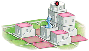 - Zuerst mit einem der Arbeiter auf ein benachbartes Feld ziehen (wie der König beim Schach). Dabei muss der Arbeiter auf derselben Ebene bleiben bzw. darf maximal eine Ebene höher steigen.