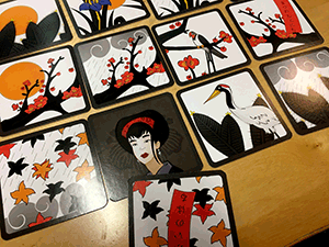 | Der einfacheren Spielerklärung halber hier nur ein Ausschnitt. Der Spieler hat soeben seine schwarze Geisha gegen die Karte auf dem Foto ganz unten getauscht. Sein Gegner hat nur zwei Möglichkeiten: Die Karte ganz links unten (Ahorn) oder rechts oben (Flagge) mit einer roten Geisha zu tauschen. Je nachdem, bleiben für den nächsten"schwarzen" wiederum beschränkte Möglichkeiten. Bild: spielwiese.at |