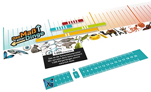 Wie aber wird, bei so unterschiedlichen Bandbreiten, überprüft, wer mit seiner Schätzleiste richtig und wer falsch liegt? Verblüffend einfach! Auf der Rückseite der Karten steht nicht nur die richtige Antwort mit ein paar zusätzlichen Informationen als Zahl, auf der Rückseite befindet sich auch ein Ausschnitt einer Bilderleiste, die entlang des Maß aller Dinge läuft. Legt man die Antwortseite nun so an, dass sich die Bilder genau überlappen, ist durch einen Pfeil auf der Karte auf Skala des Maß aller Dinge der Zahlenwert exakt bestimmt (siehe Foto rechts oben).