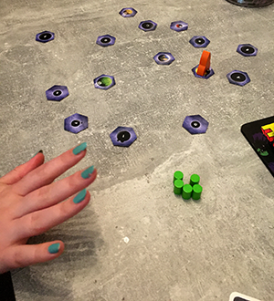 Die Ausgangsposition: Drei Planeten liegen offen am Tisch (warum drei, sagen wir weiter unten) und nur der aktive Spieler weiß, zu welchem die Rakete unterwegs ist. Er wird bei Contact „Quelle“ genannt, die Mitspieler sind die „Crew“. Die Quelle legt eine Hand auf den Tisch, hebt sie eine bestimmte Weile, setzt sie mit einem Klopfen wieder ab, hebt sie wieder, dieses Mal vielleicht länger, klopft wieder. Das kann sich mehrmals wiederholen. Damit signalisiert die Quelle die Flugroute. Jedes Klopfen bedeutet eine Zwischenlandung auf einem Planeten, die Dauer des Handanhebens soll den Abstand zwischen einzelnen Planeten beschreiben. Also: Kurzes Anheben = kurzer Flug von einem zum anderen Planeten, ei langes Anheben = da ist jede Menge Weltall zwischen den beiden Planeten.