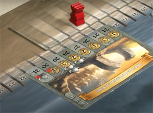 | Und darum geht's: Mit seiner Wikingerfigur zur Abenteuerkarte vorrücken und möglichst viele Belohnungen zu ergattern. Hier steht die Wikingerfigur auf dem verwschiebbaren Wikingerpfad unter dem Feld 23, das dem Spieler drei Goldmünzen bringt. | |