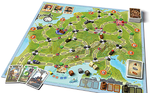 Schauen wir uns zuerst etwas genauer an, was da vor uns auf dem Tisch liegt. Der Spielplan zeigt entweder Europa oder Nordamerika mit einem Schienennetz zwischen großen Städten. Von den Städten führen unterschiedlich viele Strecken weg, auf den Strecken gibt es allerlei Weichen. Kleine schwarze Holzscheiben, die verschoben werden können, zeigen an, in welche Richtung die Weichen gerade gestellt sind, kleine grüne Holzscheiben liegen da und dort und zeigen „Fahrt frei!“ an, vor allem bei den Städten. Denn aufgedruckt sind erstmal alle Zu- und Abfahrten der Städte auf Rot gestellt. Auch die grünen Holzscheiben lassen sich im Verlauf des Spiels verschieben.