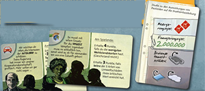 | Bei Kyoto hält jeder Spieler seine beiden Agendakarten (l.) geheim. Sie geben an, welchen Lobbys er angehört und welche "Belohnungen" am Spielende warten. Voraussetzung: Er handelt entsprechend den Lobbyzielen, wenn pro Runde eine Umweltstudie (r.) veröffentliicht wird . Bilder: Deep Print |