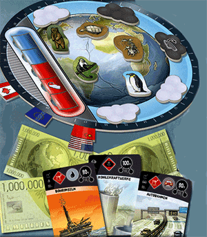 - sie gibt ein sogenanntes Reduzierungsziel vor. Das funktioniert über die übereinstimmenden Symbole auf den Wohlstandskarten. Meist geht um Tonnenangaben für CO2, die insgesamt in dieser Runde eingespart werden sollen; es können aber auch Symbole für Erderwärmung, Luftverschmutzung oder Tiersterben sein