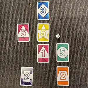 Wie’s geht, ist schnell geschildert. Von den insgesamt 48 gut gemischten Karten kommen in jeder Runde 16 davon als 4x4-Auslage auf den Tisch. Der aktive Spieler würfelt, zum Beispiel eine 5, und darf sich eine passende Karte mit einer 5 aus der Auslage nehmen. Gibt es keine Karte mehr mit dem gewürfelten Wert, ist eine Runde zu Ende. Nun dürfen die Spieler nur jene gesammelten Karten behalten und mit in die nächste Runde nehmen, deren Farbe nicht (!) mehr in der Auslage vertreten ist. Außerdem, und das ist echt hart, muss derjenige Spieler, der die Runde beendet hat, noch seine höchste Karte abgeben.