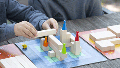 Außer diagonal ist bei Talo fast jede Position erlaubt. Quer, hochkant, eine Brücke, ein Überhang – Hauptsache alles bleibt im Raster und stabil. Nicht vergessen: Mit seiner Spielfigur will man schrittweise nach oben! Dazu darf und wird man oft auch „Wege“ benutzen, die andere gebaut haben, weil die Bauten zusammenwachsen. Vor allem bei der Spielfläche Blauer Inselplan, der später hinzugekommen ist und durch verringerte Baufläche die Herausforderung verschärft.