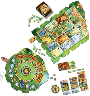 Die Auswahl der Karten erfolgt über die zentrale Wanderkarte, auf der 4x4 Karten ausliegen. Sogenannte Wanderplättchen setzte ich ein, um von der Wanderkarte eine bestimmte Karte, soweit erreichbar, zu nehmen. Erreichbar bedeutet, dass das eingesetzte Wanderplättchen die Koordinate in der Auslage vorgibt. Weil Wanderplättchen dafür in Kerben am Rand der Wanderkarte gelegt werden und dort liegen blieben, reduzieren sich vornezu die Möglichkeiten etwas an bestimmter Stelle von der Wanderkarte zu nehmen. Das ist spielmechanisch sehr geschickt gelöst!