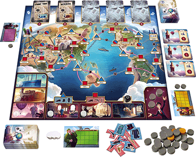 Der Name des Spiels signalisiert den meisten, dass da wohl Jules Vernes Geschichte von Phileas Fogg eine Rolle spielt, der wettete, in 80 Tagen um die Welt reisen zu können. Und so ist es auch. Nur, was die Zeiteinteilung angeht, legen wir bei diesem Brettspiel einen anderen Maßstab an. 50 bis 70 Minuten tun’s auch.