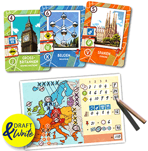 | 28 Karten zu Ländern in Europa gibt es, sieben davon landen am Rundenende vor jedem Spieler. Dann werden die Eigenschaften verglichen und auf das Wertungsblatt übertragen. Bild: Game Factory |