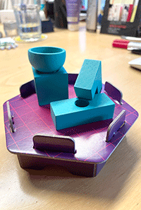 Der „Koolio“ muss in eigenem Interesse schauen, dass seine „Skulptur“, die er da aufstellen will, möglichst erraten wird. Was nicht einfach ist, wie schon eingangs erwähnt. Denn die 17 Holzteile haben gefühlt mehr unmögliche wie mögliche Formen. Und die Scheibe, die der „Koolio“ sofort als Hinweis für die Uhr sieht, die da bei seiner Szene Nummero 2 auf dem Tisch steht, nehmen die Mitspieler überhaupt nicht wahr, sondern deuten den Kegel als Weihnachtsbaum von Wahlmöglichkeit 5 …