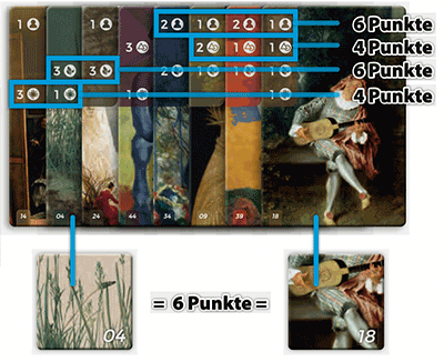 | Dieses Detail aus der Spielanleitung verdeutlicht sehr gut den Weg zum Ziel: Man sammelt Gemäldekarten, die in vier Reihen eine gewisse Symbolik zeigen. Immer nur die längste zusammenhängende Kette bringt am Ende Punkte. Und wenn man dazu noch im Museumsshop passende Gemäldeplättchen als Andenken erworben hat, gibt es noch weitere Punkte. |