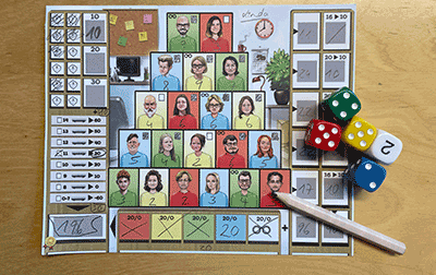 Und natürlich macht es Sinn, sich genau zu überlegen, wo eine Zahl gerade auf die Brust eines der 20 Bürohengste und -stuten gekritzelt wird. Denn es wartet eine Reihe von Prämienpunkten. Wenn man nicht völlig abschmieren will, müssen die Werte von mindestens acht Angestellten gleich oder höher sein als jene der zwei direkt in der Pyramide Untergebenen. Sonst setzt es 60 Minuspunkte! Das lässt sich mit anderen Prämien niemals ausgleichen, beispielsweise als Erster allen Angestellten einer Farbe einen Wert zugeordnet zu haben. Oder allen Brillen tragenden Nerds. Zusatzpunkte gibt es auch, wenn man in einer Stufe der Pyramide über eine bestimmte Summe an Werten kommt.