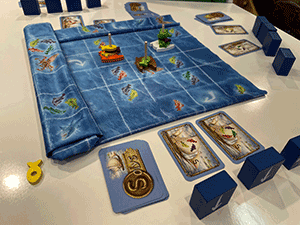 Am Anfang war das große, weite Meer. Dann zog immer mehr Nebel auf und das offene Meer erschien immer kleiner und kleiner. Gemeint ist damit das Spielfeld. Bei Maldivia ist das Meer ein bedruckter Stoff, der von Runde zu Runde an den Rändern umgeschlagen wird. Das bewirkt zweierlei: Das Spielfeld engt sich zusehends ein und Schiffe, die am Spielfeldrand waren, müssen nach innen auf ganz andere Felder versetzt werden. Was die Taktik durcheinanderhaut.