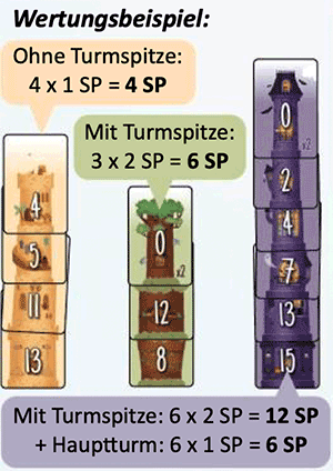 Denn um die fünf am Tisch ausliegenden Karten rittern alle. Und alle haben für die Türme in fünf unterschiedlichen Farben nur eine Chance. Es gibt keinen zweiten grünen oder zweiten andersfarbenen Turm.