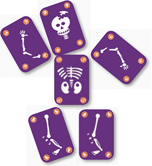 | Für ein vollständiges Skelett (hier eines mit gebrochenen Knochen) braucht es immer sechs Karten. Bild: Djeco |