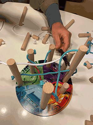 | Mit den Kabeln heißt es durchdacht zu hantieren, damit das Gebilde aus Strommasten mit daran hängenden schwarzen Katzen nicht einstürzt. Bild: spielwiese.at |