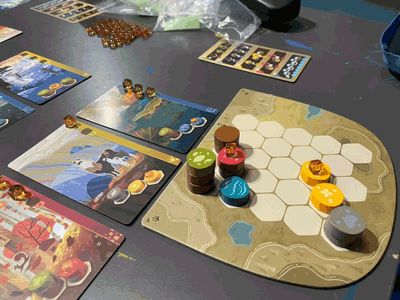 Daran kann man sich gut festhalten, wenn man das Spiel und seine Besonderheiten Neulingen erklärt. Jeder hat ein kleines Tableau mit Sechseckfeldern vor sich. Es ist noch leer. Hier erschaffen wir die Landschaften. Die Landschaften werden aus runden Holzsteinen in sechs Farben geschaffen. Blaue Holzsteine stehen naheliegend für Wasser und werden von Wassertieren bevorzugt, graue für Berge usw. Alle Holzsteine sind anfangs im Stoffbeutel, für den Start kommen jeweils drei blind gezogene auf die fünf Felder des gemeinsamen Spielplans in der Tischmitte. Wer an der Reihe ist, nimmt immer alle drei Holzsteine eines Feldes, das dann später wieder aufgefüllt wird.