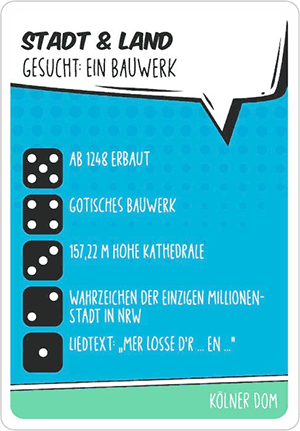 Mit einem Zahlenwürfel hat eingangs jeder Frage jeder und jede mit 1 bis 5 „eingestellt“, ob er oder sie einen eher allgemeinen oder einen eher genaueren Hinweis haben möchte. Wer die höchste Zahl gewählt hat, bekommt den Hinweis zuerst vorgelesen und darf einmal raten. So einfach, so gut. Bei Gleichständen werden die Regeln dann allerdings schon komplizierter und nicht hundertprozentig glatt. Doch man sollte das Spiel nicht zu ernst nehmen. Schon die Größe der Schachtel und die gesamte Gestaltung wollen signalisieren: Spielt, es soll (nur) Spaß machen! Errät zum Beispiel niemand den gesuchten Begriff, dann bekommt der Fragesteller dieser Runde die Karte als Punkt.