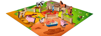 Chaos auf dem Bauernhof erfindet keineswegs das Rad des Kinderspiels neu, es ist jedoch großteils eine runde Sache. Angesprochen fühlen sich Kinder ab 3 Jahre, doch auch noch im Schulalter spielen Kinder begeistert mit, wie wir beobachten konnten. Die Tiere sind auf dem Bauernhof ausgebüxt, sie sollen wieder auf ihre Koppeln. Darum geht’s. Es gibt eine kooperative und eine Wettbewerbsvariante. In der kompetitiven Variante spielen die fünf Zäune, die versetzt werden, eine größere Rolle. Denn jedes Kind ist für eine Tierart und damit für deren spezielle Weide zuständig und will, dass seine vier Tiere als erste wieder auf der richtigen Weide zusammenfinden. Nicht alles ist dabei logisch, aber Kinder hinterfragen das nicht, wenn ein Zaun dadurch verschwinden kann, dass sich auf beiden Seiten gleiche Tiere befinden. Es gibt Pferde, Hühner, Ziegen, Schweine und Kühe. Alle allerliebst.