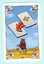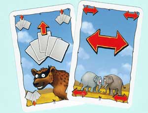 | Die Hyäne muss für die eine Sonderaktion herhalten: einem Mitspieler eine Karte zu nehmen. Die rechte Sonderkarte führt einen Richtungswechsel herbei. | |