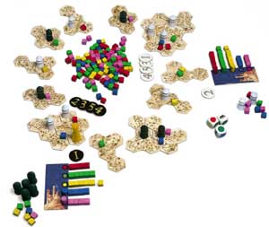 Zurück zur Dynamik: 15 Spielteile aus jeweils vier unterschiedlich zusammengesetzten Waben werden als Kreis in die Tischmitte gelegt und bilden den Spielplan. Die Teile sind Provinzen, die der Kaiser Karl durchschreitet. Jedes Land ist ein Spielfeld. Weil diese Ländereien nach und nach zusammengefügt werden, verkürzen sich logischerweise die Runden, die Karl macht, und das Spiel wird schneller und schneller. Ziel ist, die meisten dieser Provinzen durch Burgen zu besetzen.
