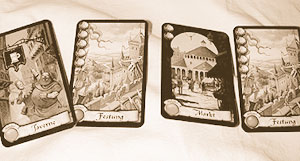 Eine entscheidende und beliebte Rolle ist die des Händlers. Er erhält automatisch ein Extra-Goldstück und für jede grüne Bauwerkkarte, die er ausliegen hat, noch eines dazu (der Prediger wiederum für blaue, der Söldner für rote). Der Baumeister ist nicht zu unterschätzen, denn durch ihn darf man nicht nur eine Karte "bauen", sondern bis zu drei. Und der Söldner bekommt eher gegen Ende des Spiels und bei größerer Spieleranzahl Gewicht: Er macht nämlich errichtete Bauwerke zunichte. Je nach Zeitpunkt, der für die Aktion des Charakters gewählt wird, können übrigens unter Umständen unterschiedlich hohe Punktegewinne erzielt werden.