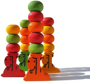 Nur am Material gibt's nichts auszusetzen: Das ist höchster Standard! Die kleinen Holzäpfel werden einfach ineinander und den Murmeltieren als Lastenträger auf den Kopf gesteckt. Johann Rüttinger hat sich seiner Zauberstäbe aus seinem Erwachsenenspiel Die drei Magier dem Jahr 1985 erinnert, die als Alternative zum herkömmlichen Würfel ihre guten Dienste leisten: Sie geben gleichzeitig mehrere Anweisungen und werden paarweise geworfen und auch paarweise ausgewertet. Ihre Zählpunkte bzw. Symbole kommen je nach Phase zum Einsatz.
