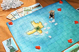 | Die Spieler brauchen Steine, damit sie Pedro übers Wasser führen können. Sonst plumpst er hinein und der Spieler kassiert einen Piranha. | ||